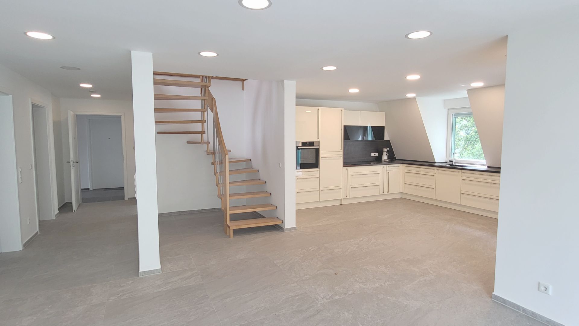 Die größtenteils bodentiefen Fenster sind 3-fach-verglast und mit elektrischen Jalousien ausgestattet. Die zwei Schlafräume eignen sich perfekt für eine kleine Familie. Man kann aber auch ein Büro, ein Arbeits- oder Ankleidezimmer einrichten. Der großzügige, ausgebaute Spitzboden bietet eine sehr schöne, zusätzliche wohnraumähnliche Nutzfläche. Er verfügt teilweise über Stehhöhe und ist bequem über eine breite Holztreppe aus dem Wohnbereich zu erreichen.